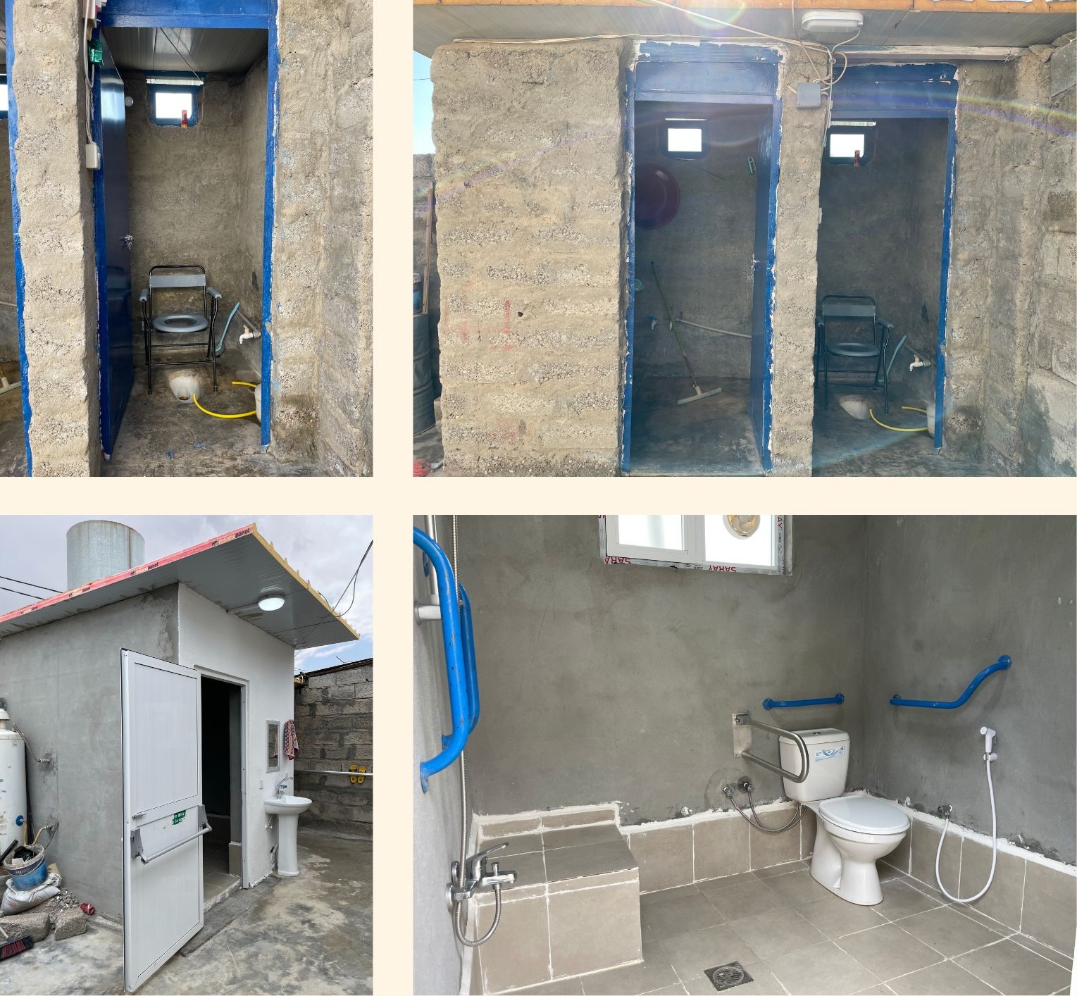 Later, when most residents of the Syrian refugee camps had safe, permanent shelters, Peace Winds shifted the focus of construction upgrades to prioritize accessibility for persons with disabilities and older persons. A disproportionately high number of refugees have disabilities, which is no surprise given that they fled a warzone and have limited medical care. Home modifications for families with persons with disabilities included wheelchair ramps, bathroom handrails, handicap-accessible latrines and showers. These were paired with other accessibility upgrades to public spaces in the camps. Together, they have vastly improved safety and independence for people in wheelchairs, senior citizens, and others with limited mobility, while lightening the caregiving responsibility of families so that they can focus on work or school.