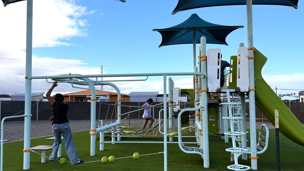 Children play at the new playground and community space at Ohana Hope Village