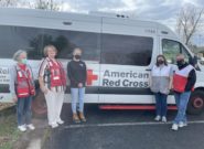 Four Red Cross volunteers and one Peace Winds employee stand in front of a large American Red Cross emergency response van
