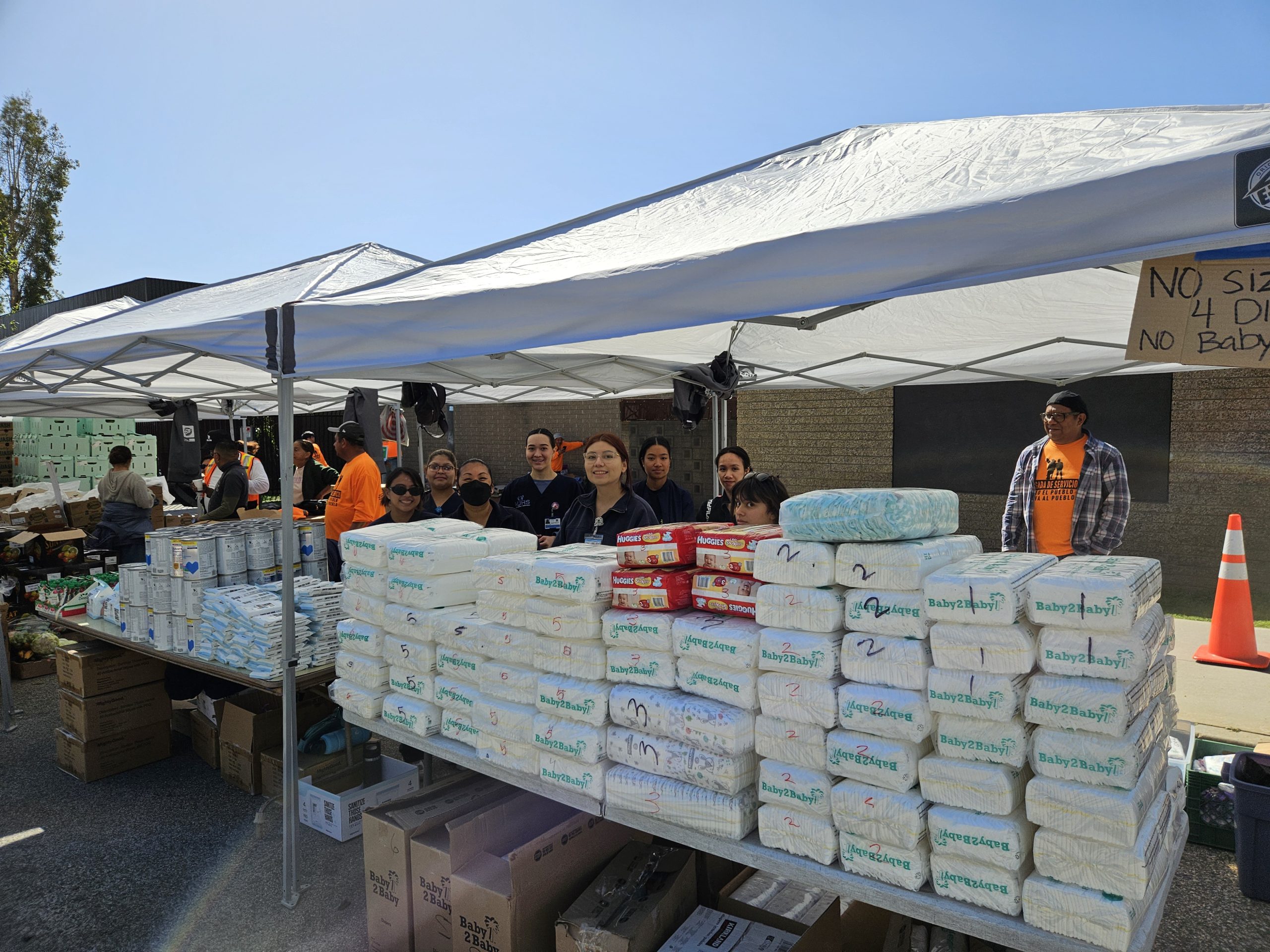 Baby supplies at PCJC distribution site (left); day laborers clear wildfire debris (right)